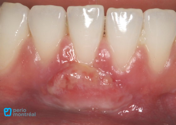 - Mucogingival deformity associated with recession and a lack of keratinized tissue