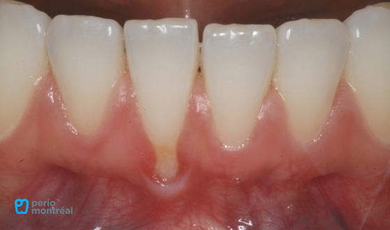 This patient “L.P.” presented with a chief complaint of “I bit in to a peach and caused this recession”. There is a Miller Class II recession defect on tooth #41 with a lack of keratinized tissue. The patient reports mild sensitivity to brushing.